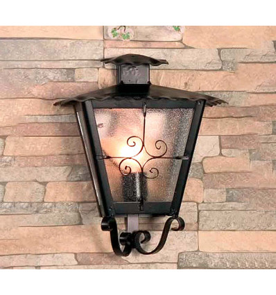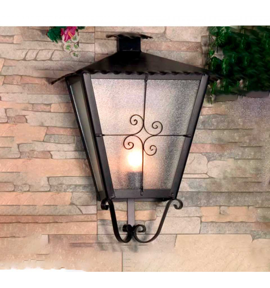 Aplique de forja con una luz y cristal mate. Este aplique viene con un detalle decorativo en la parte fontal, realizado también de hierro. El techo, fabricado en chapa, está ondulado, lo que le da un toque rústico al modelo.