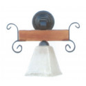 Aplique de madera con detalles en forja de una luz. Esta va adornada con una tulipa de cristal blanco opaco.