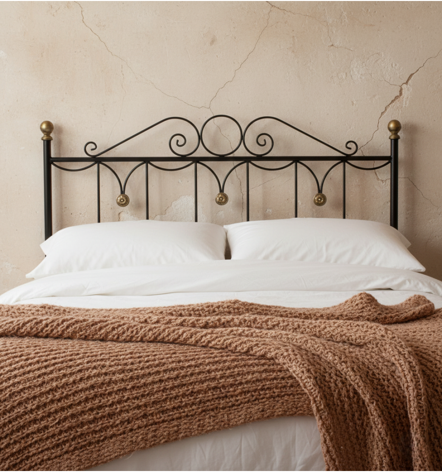 Cabecero de forja barato de estilo rústico con un diseño sencillo, que tienes disponible para las principales medidas de colchón: 90-105-120-135-140-150 cm.