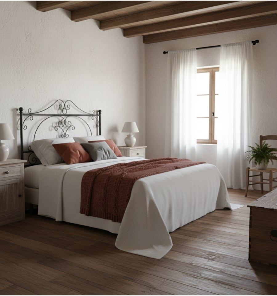 Si las paredes del dormitorio son de un color más oscuro, puedes buscar hacer un contraste con un cabecero de forja blanco como el de la foto, y al revés, utilizar los tonos más oscuros del cabecero para paredes más claras.