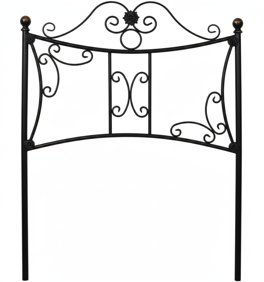 El diseño de este cabecero es sencillo pero elegante, con unas patas rectas acabadas en bola y unos dibujos de hierro en la parte superior con una roseta decorativa en el centro. Este cabecero está disponible en una amplia gama de acabados, como blanco, marfil o negro, para que puedas elegir el que mejor se adapte a tus necesidades.