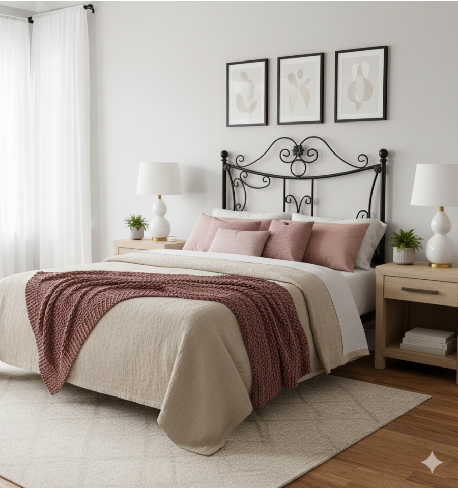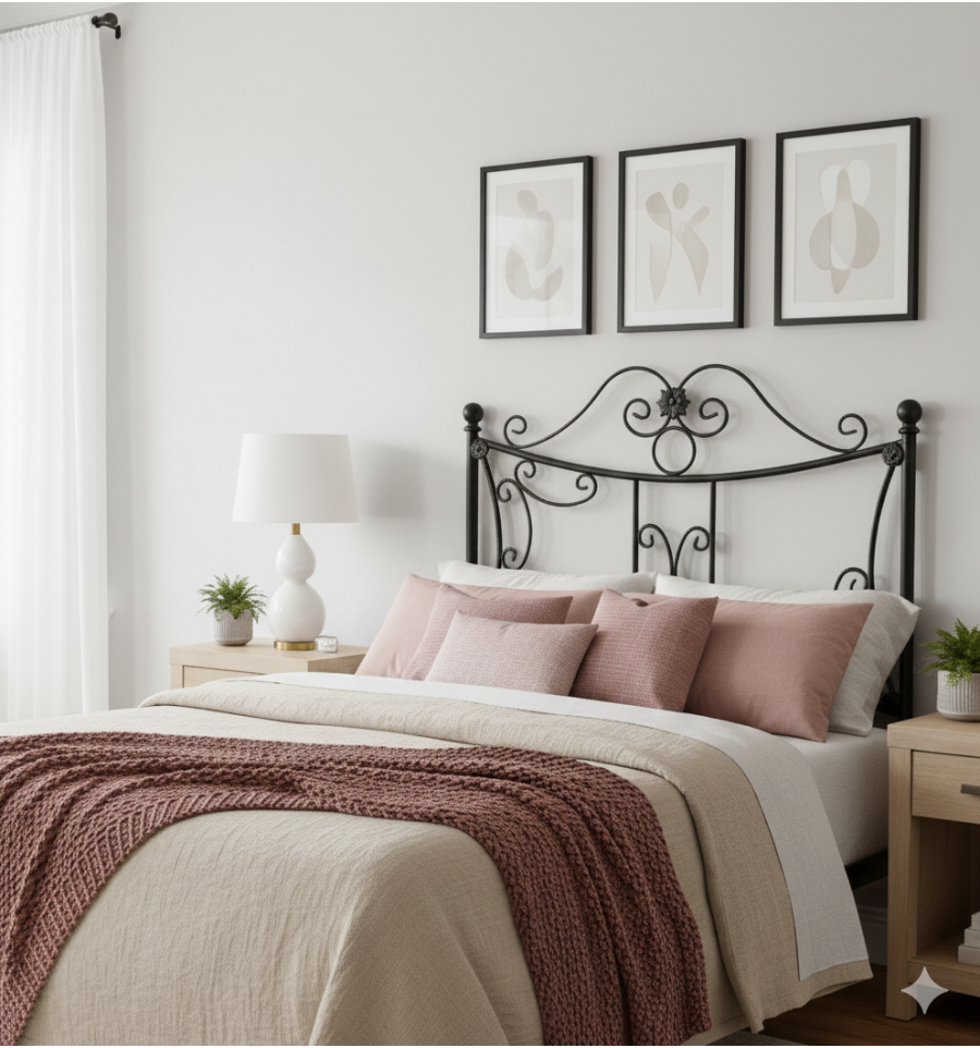 Si quieres completar la decoración de tu habitación, puedes combinar este cabecero de forja con nuestras banquetas de forja. Estas banquetas pueden ser del mismo color que el cabecero y te ofrecen un espacio extra para sentarte o para colocar tus objetos personales.