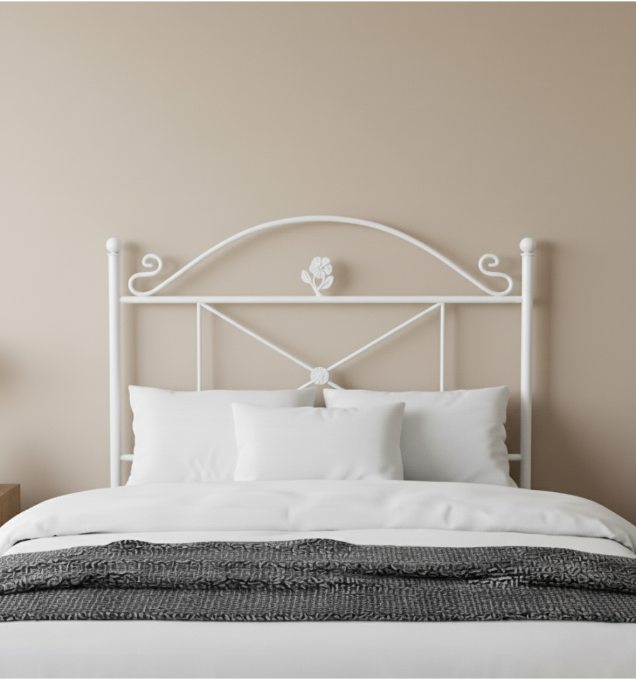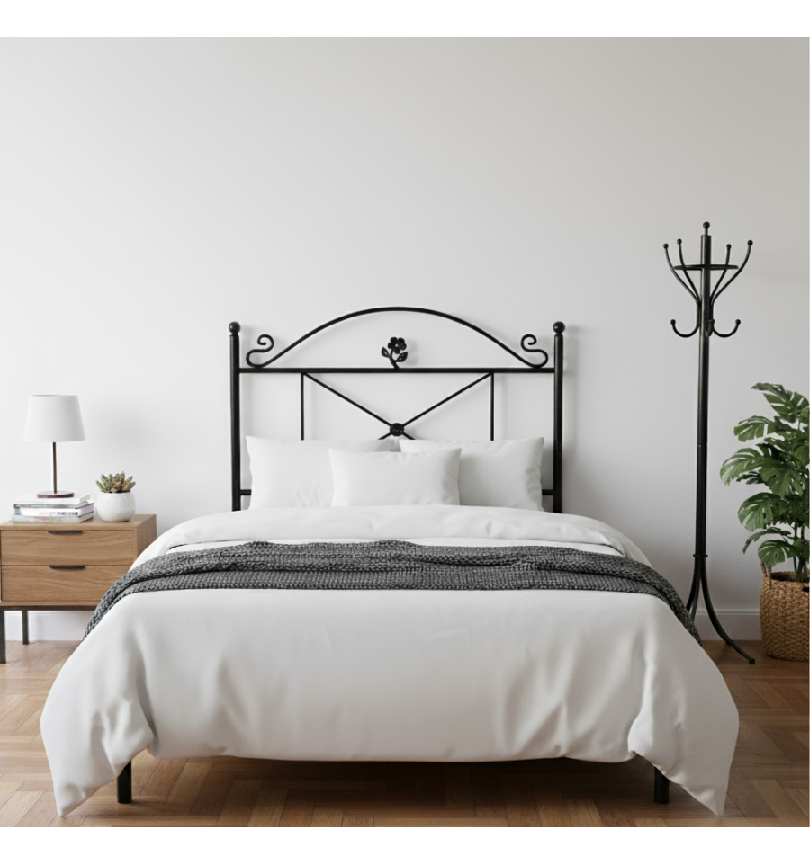 Con una hermosa flor en la parte superior y un elegante arco de hierro encima, este cabecero no solo añade estilo a la habitación, sino que también brinda un toque de frescura y vitalidad. Además, la roseta de fundición en el centro agrega un encanto adicional al diseño.