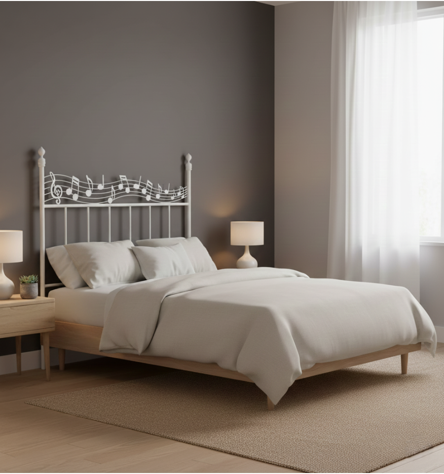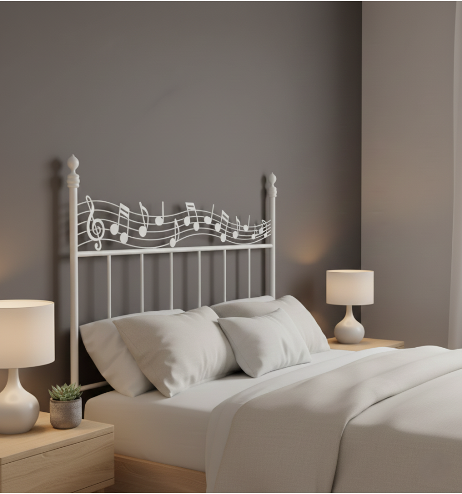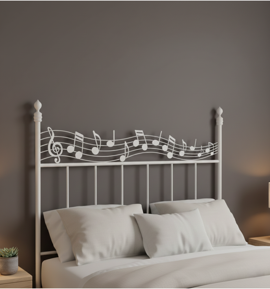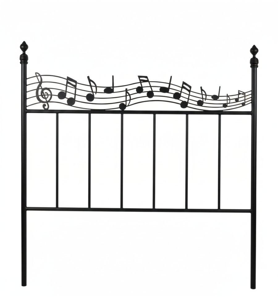 Cabecero de forja que tiene una divertida decoración de notas musicales en la parte superior.