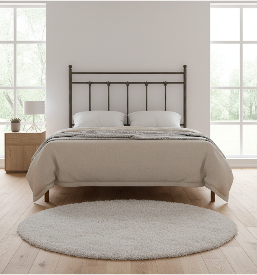 Como hemos comentado antes, para sacar partido a un cabecero rústico no es necesario decorar todo el dormitorio en ese estilo ya que lo puedes colocar como un elemento independiente dentro del dormitorio. Su diseño sencillo hará de este cabezal de forja un elemento idóneo para dormitorios sin un estilo claro definido, combinando con piezas en madera como una cómoda o una mesita de noche.