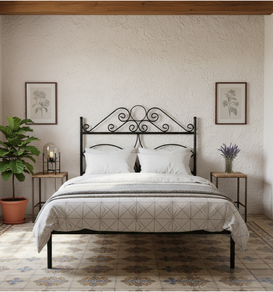 Se puede combinar perfectamente con mesitas de noche de forja, banquetas de forja y otros muebles de forja, creando un conjunto armónico y atractivo. Se entrega a pie de calle o de portal.