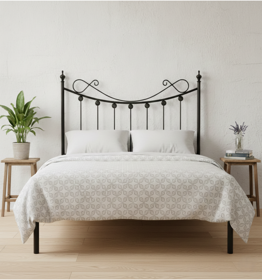 Para los amantes de los dormitorios rústicos, sin duda los cabeceros de forja son uno de los principales complementos que puedes adquirir. En este caso, el modelo Andrea es una pieza diferente para darle un toque de forja al dormitorio. La parte superior lleva un bonito y sencillo dibujo de hierro con líneas curvas, y los barrotes verticales llevan un pequeño aro en la parte de arriba. Las patas son redondas y lisas y llevan una terminación muy característica de los cabeceros rústicos.