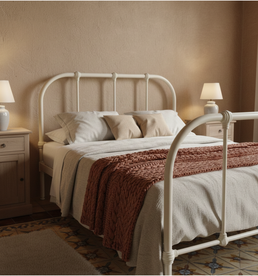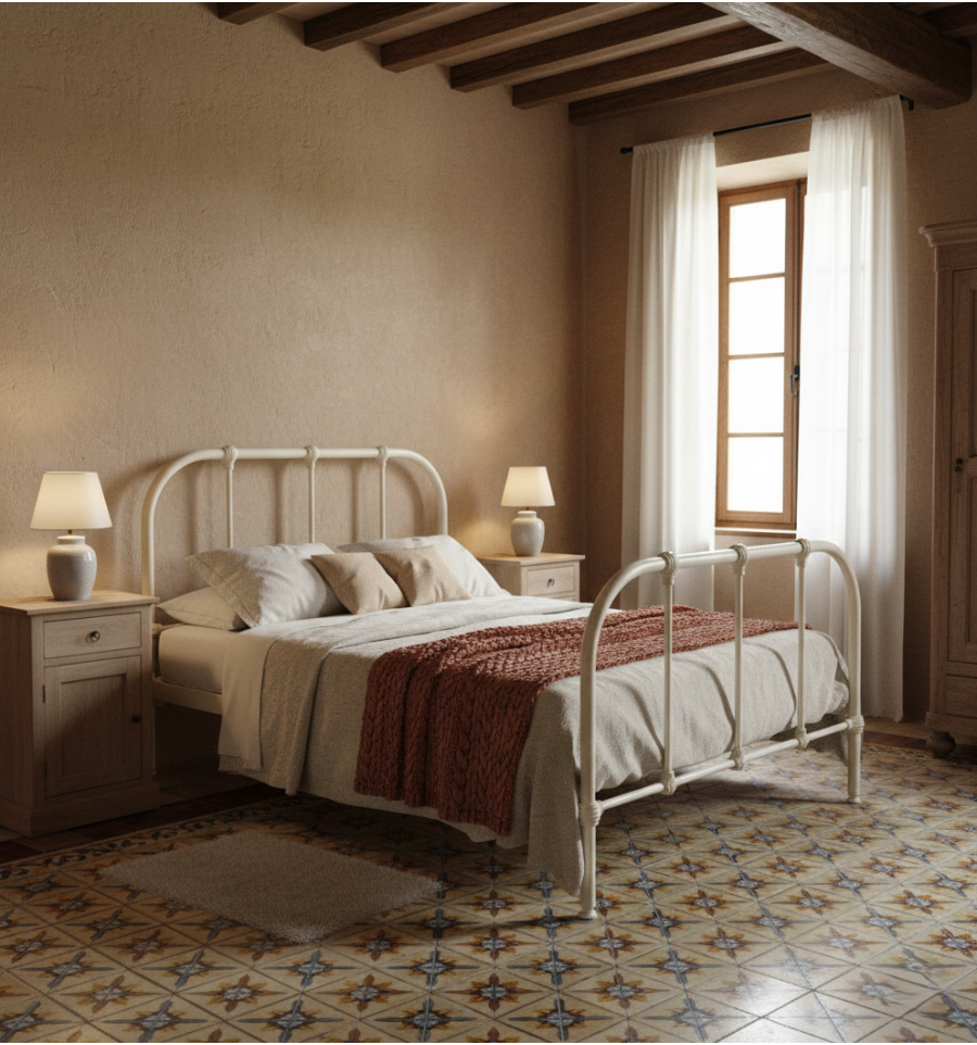 Cama de forja de líneas curvas y simples. Una cama clásica que sigue de moda año tras año.