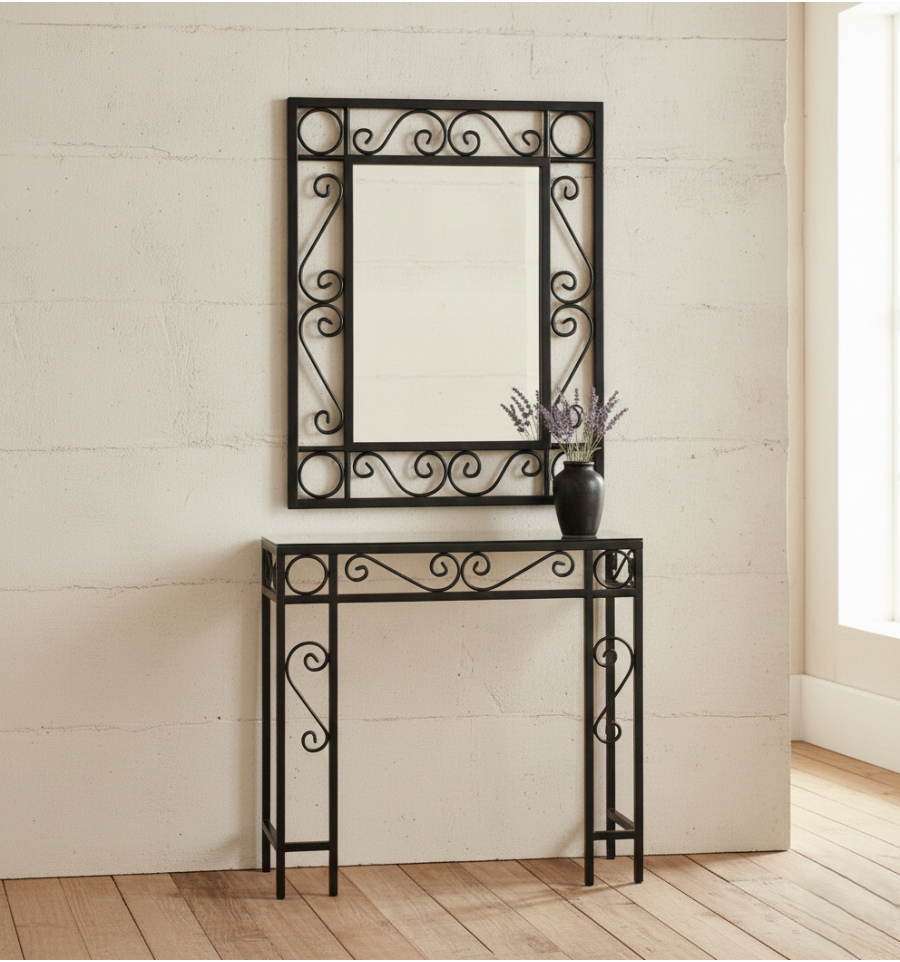 Entrada de forja que está formada por una consola con el espejo a juego. Este recibidor lleva el cristal incluido.