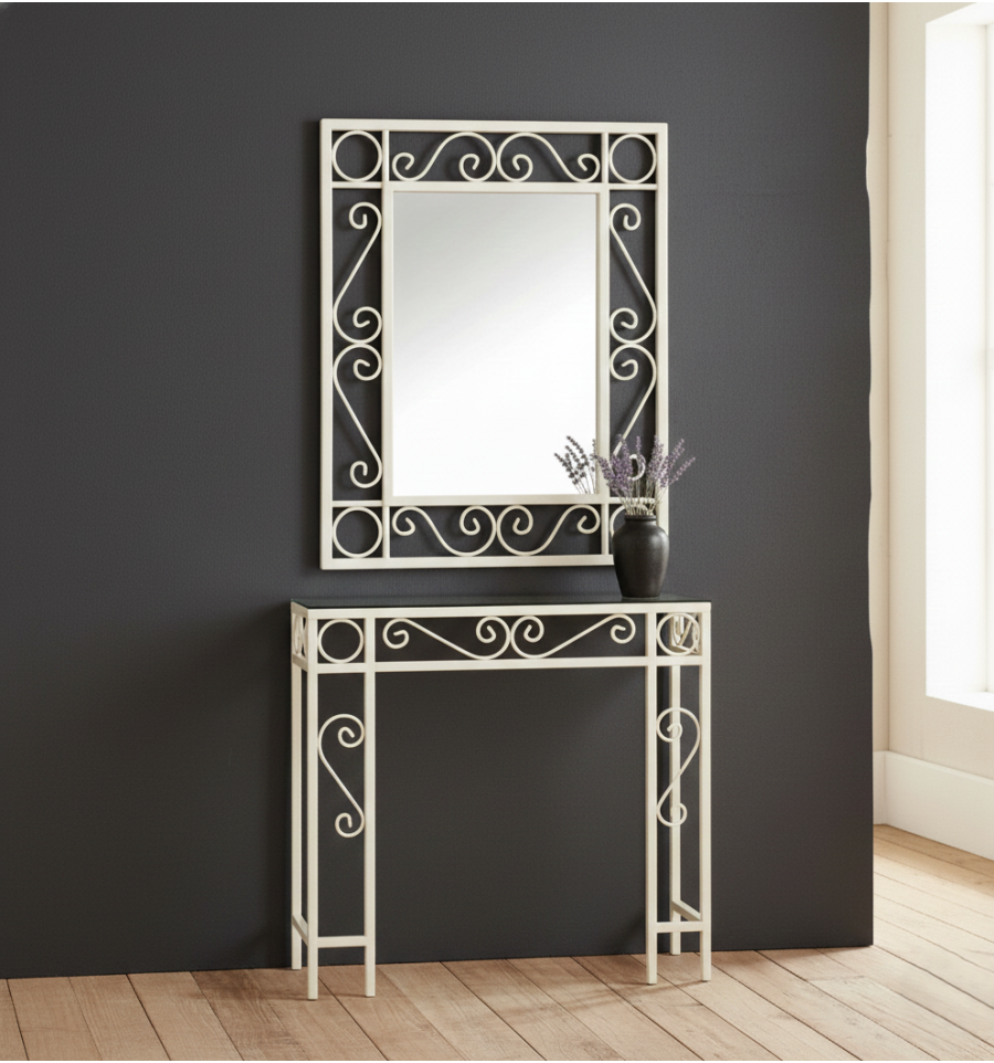 Consola de forja con espejo a juego de estilo rústico, y que tienes disponible en varios acabados de pintura.