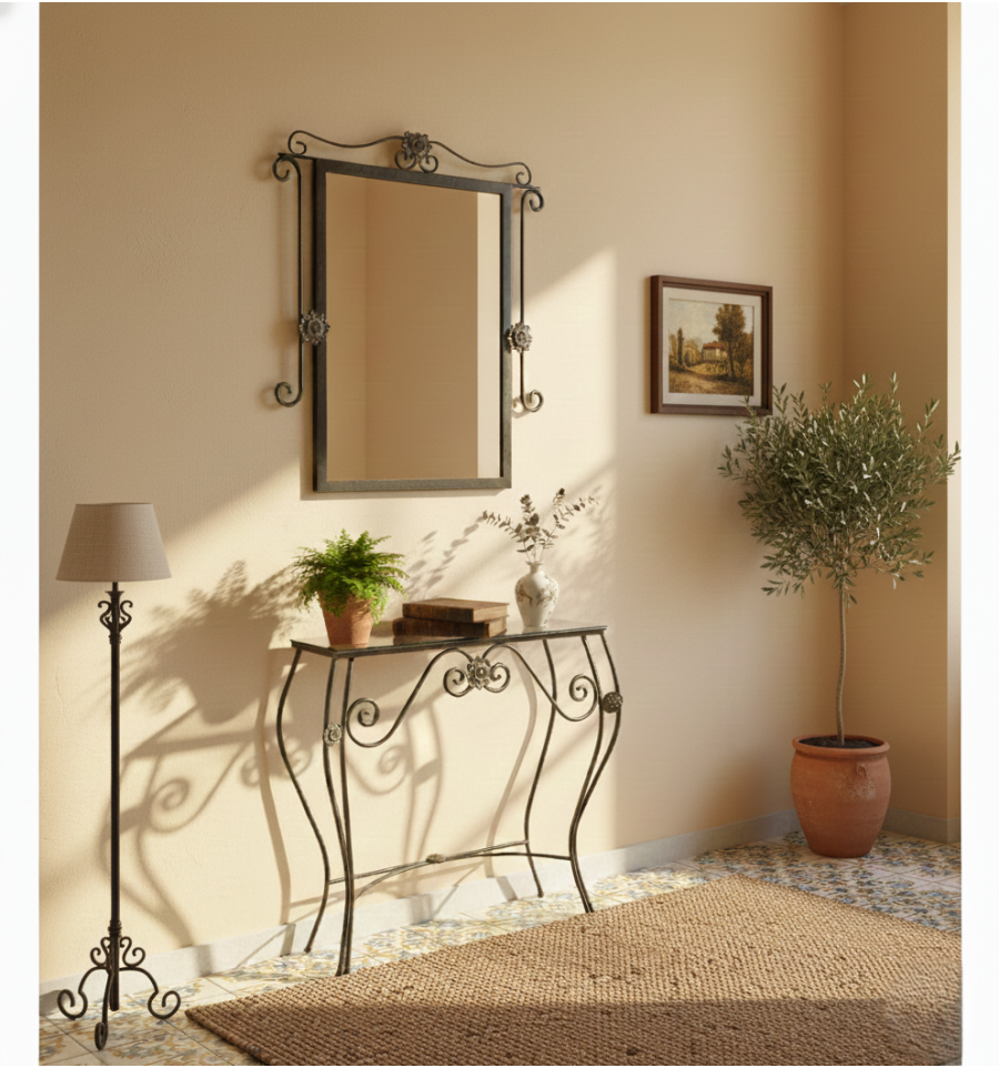 Para quienes buscan una decoración armónica, ofrecemos la posibilidad de combinar esta consola con el espejo de forja a juego disponible en nuestro catálogo de espejos de forja, creando un conjunto que captura la atención y embellece cualquier entrada o sala de estar.