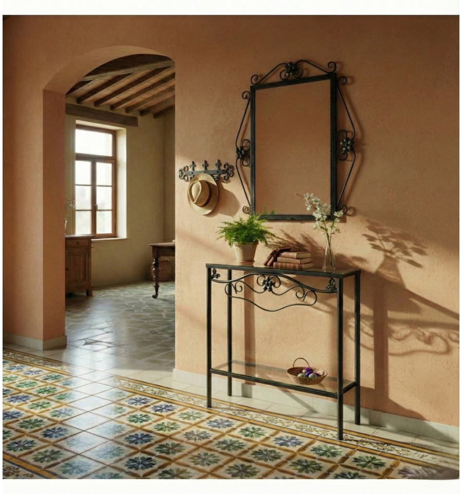 Descubre nuestra consola de forja para recibidor, una pieza artesanal que refleja la esencia de la tradición española en hierro forjado. Sus líneas sencillas y estilo rústico la convierten en un complemento perfecto para tu recibidor.