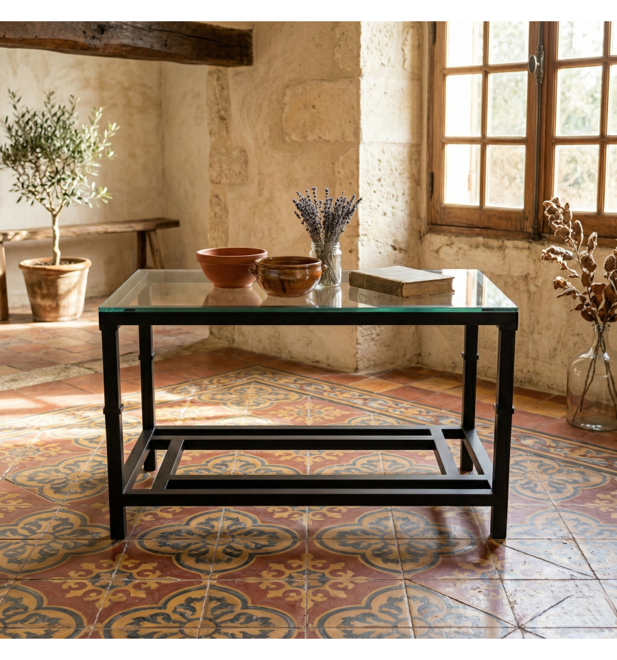 Las mesas de forja elevables Grazalema combinan funcionalidad y estética minimalista en un único diseño. Su mecanismo de elevación regulable permite transformarlas de mesa de centro a mesa de camilla cuadrada en segundos, adaptándose tanto a estancias de salón como de comedor.