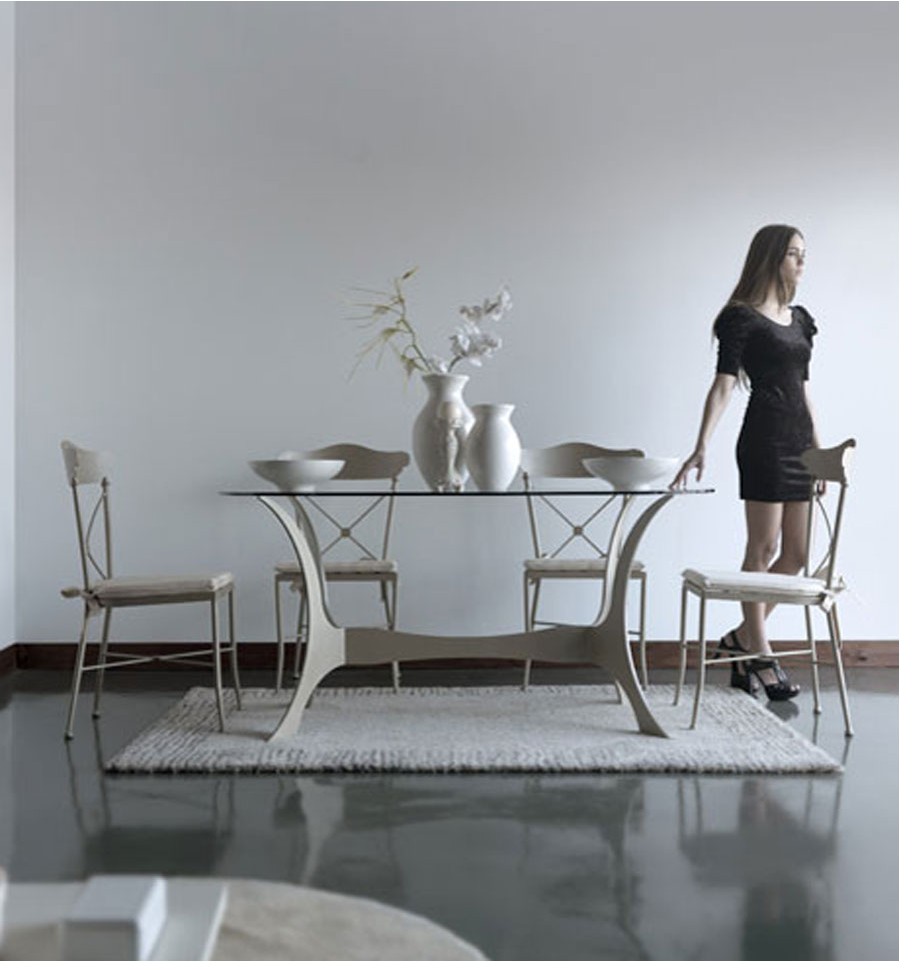 Una mesa de forja con un diseño sin duda atrevido. Su estructura está formada por cuatro patas de hierro, con líneas curvas y unidas en el centro. El cristal, que no está incluido en el precio, queda apoyado en 4 puntos. Las mesas de hierro con la tapa de cristal favorecen la creación de espacios amplios, ya que resultan muebles mucho más livianos a la vista.