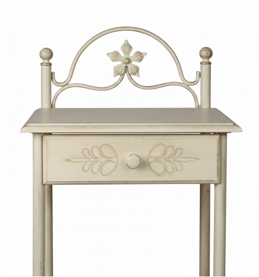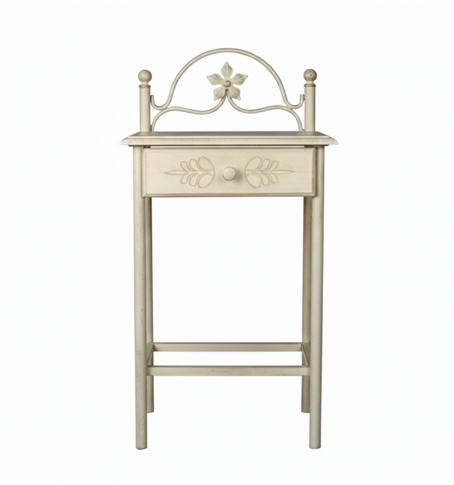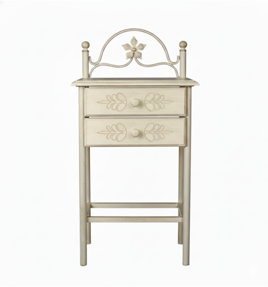 Los cajones de esta mesita de noche vienen con un grabado que le dan un toque rústico. Los acabados de la madera puede ser o cera rústica o color marfil.