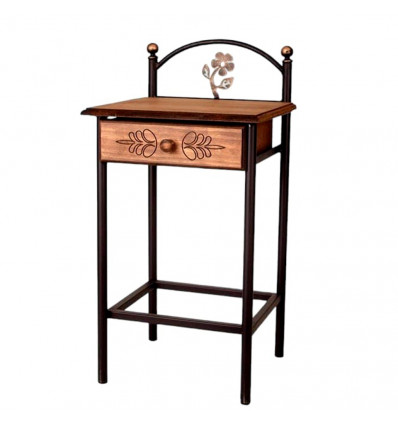La mesita de hierro y madera Morgana es una pieza de corte clásico que cuenta con un bonito detalle de una flor cortada en chapa. También está disponible con tapas de cristal que pueden sustituir a las de madera.