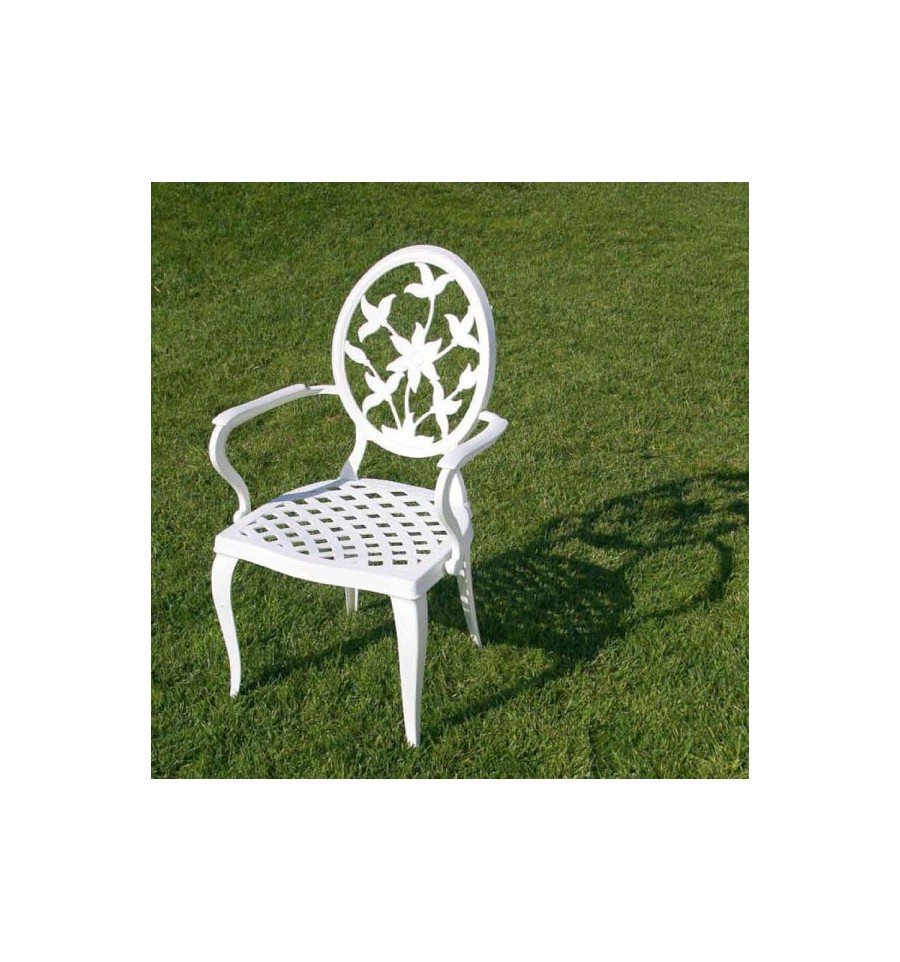 Sillón clásico de aluminio fundido con pata curva. El respaldo de este sillón tiene detalles de hojas. Este tipo de mobiliario es resistente en la intemperie.