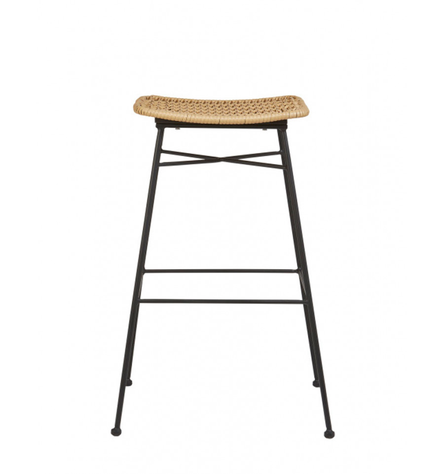 Este taburete de ratán combina una estructura de acero negro con un asiento de ratán sintético 100% virgen, tejido a mano para reproducir el encanto del natural con mayor resistencia y durabilidad.
