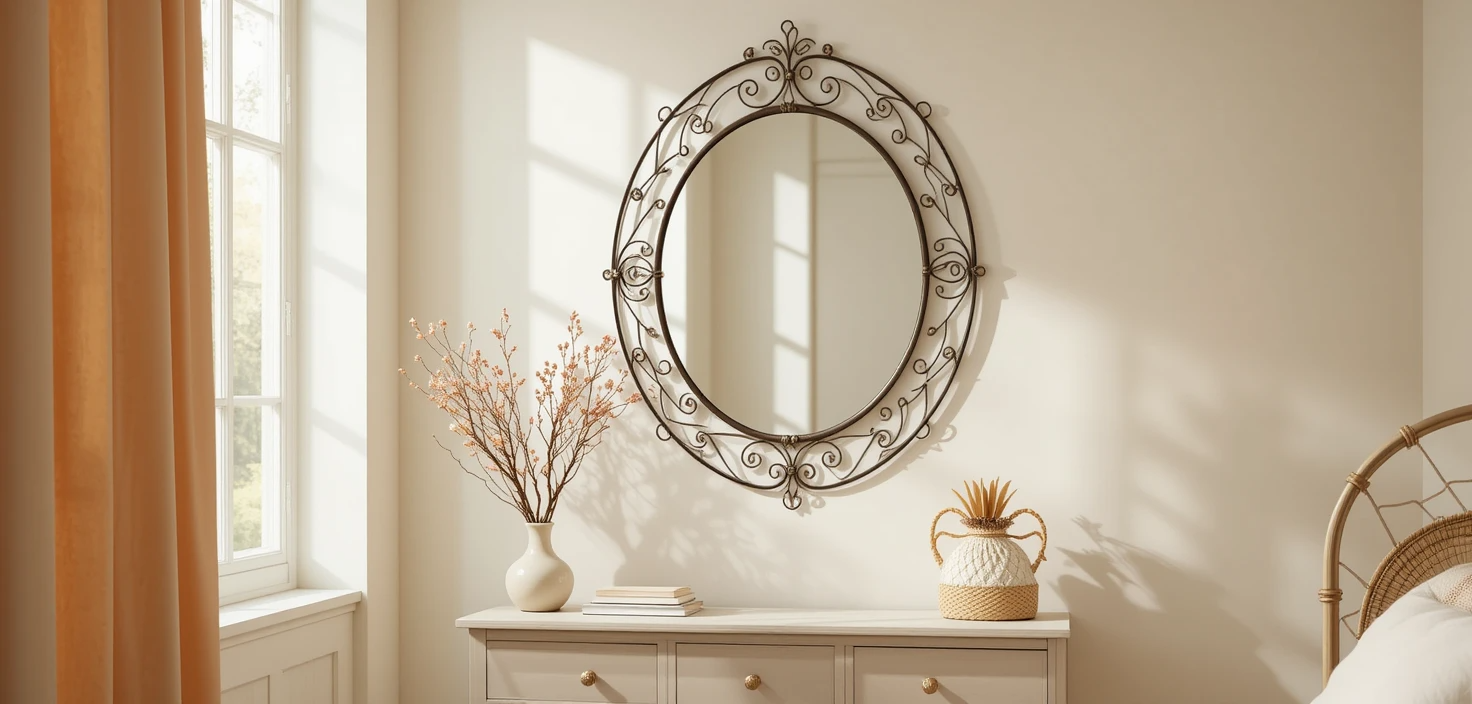 - Espejos con marco de forja: no solo ayudan a ampliar visualmente la habitación, también aportan estilo y luz.