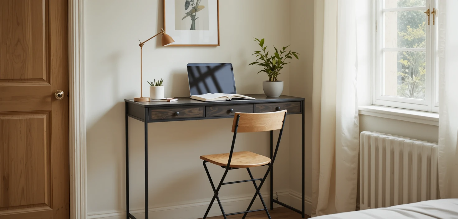 En dormitorios juveniles pequeños, cada centímetro cuenta. Una consola de forja puede funcionar como un pequeño escritorio donde estudiar, dibujar o usar un portátil. Su estructura es esbelta y no ocupa espacio visual, y puede complementarse con una silla ligera o plegable para mayor comodidad.