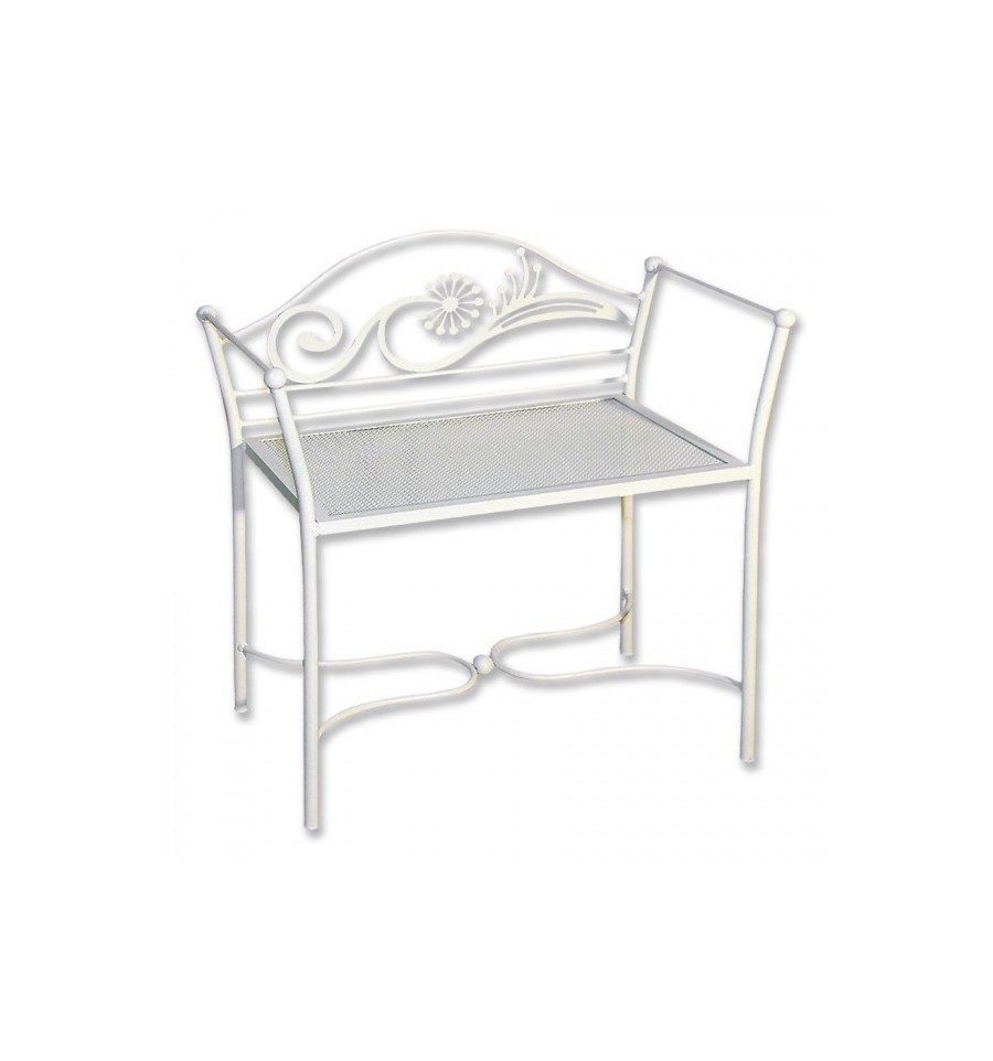 Forge banco com assento de grade de estilo romântico. Esta bancada está disponível em várias cores e suas medidas são de 73 centímetros de largura, 38 centímetros de profundidade e 78 de altura total.
