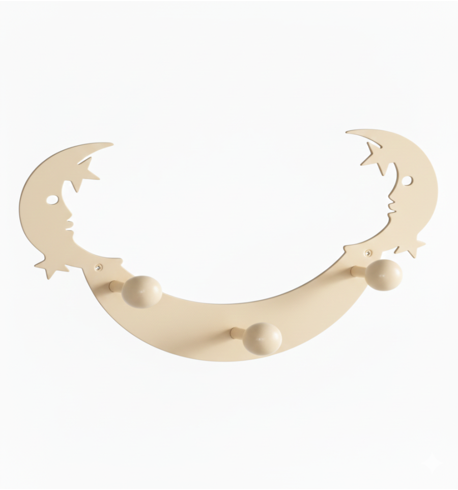 Cabide de ferro com 3 ganchos com detalhes decorativos de luas e estrelas. ideal para quartos de crianças.