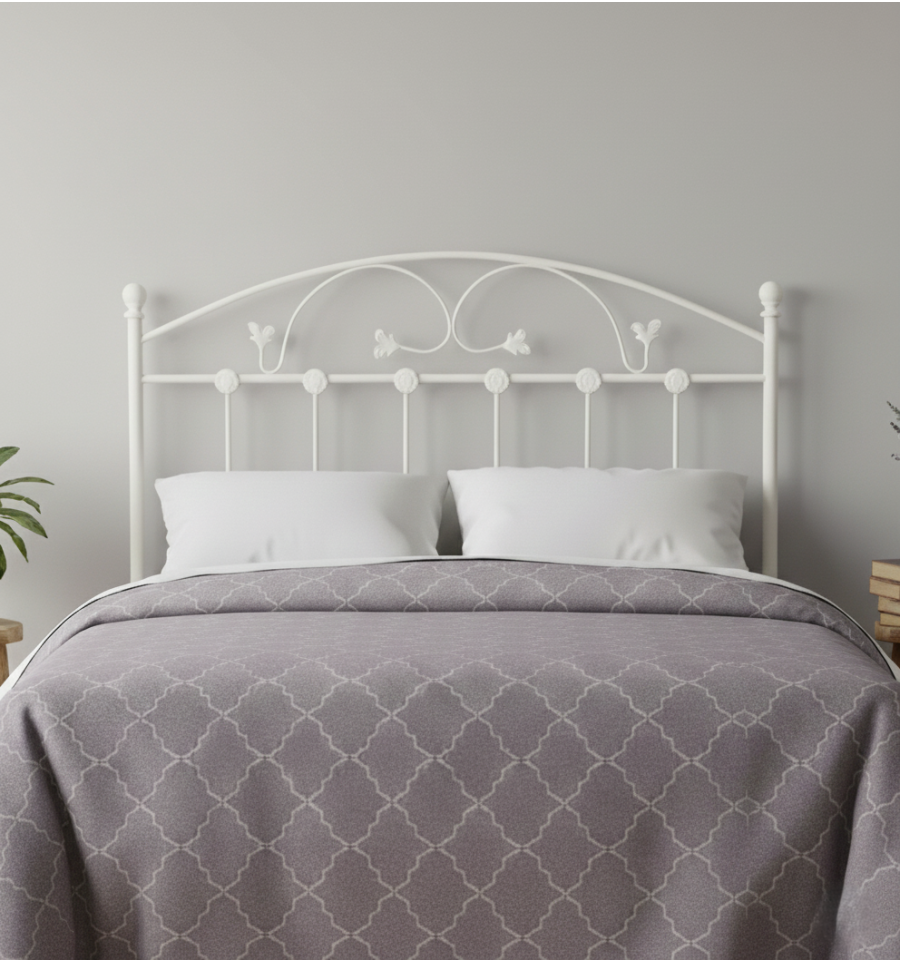 Uma cabeceira de forja branca que você pode colocar em uma parede colorida, procurando contrastes, ou que você pode encomendar em qualquer um dos acabamentos da paleta de cores.
