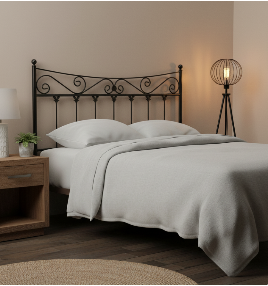 Cabeceira de forjamento de moedas feita de ferro forjado. Ao escolher as medidas de sua cabeceira de forjamento, você deve levar em conta a largura total do colchão.