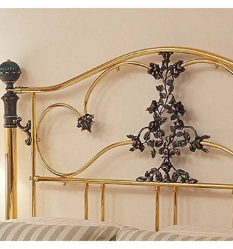 Com latão brilhante, polido e lacado no forno, esta cabeceira tem aplicações de fundição, tanto na parte central na forma de um buquê e na parte superior das pernas em forma de bola, com um óxido patinado que dão a peça um toque único.