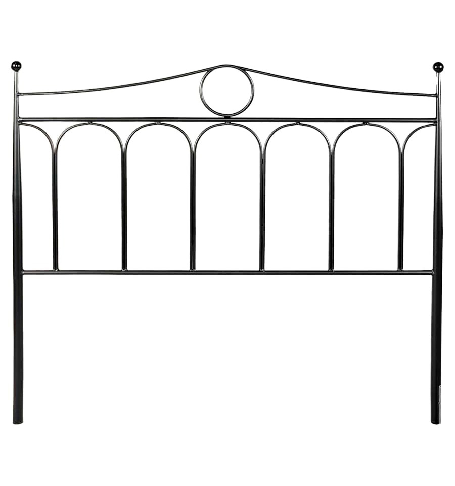 A cabeceira metálicos é fabricada em ferro e inclui figuras decorativas de pletina na zona central, além de pernas redondas rematadas com uma bola decorativa.