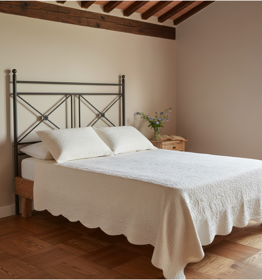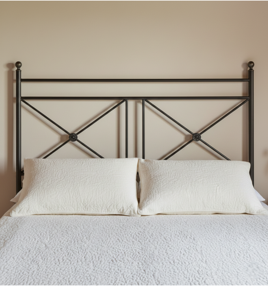 A cabeceira rústica Sandro é uma cabeceira de forja com um design original ideal para dar um toque diferente ao quarto. Feitas em tubo de ferro, as pernas são redondas e terminam no topo com uma bola. O motivo decorativo principal desta cabeceira rústica é uma cruz com uma roseta de ferro fundido no centro. As cabeceiras de 90 e 105 cm. eles só têm uma cruzeta, enquanto as cabeceiras de 135 cm. eles carregam dois completamente simétricos.