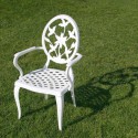 Poltrona clássica em alumínio fundido com perna curva. O encosto desta cadeira tem detalhes de folhas. Este tipo de mobiliário é resistente ao ar livre.