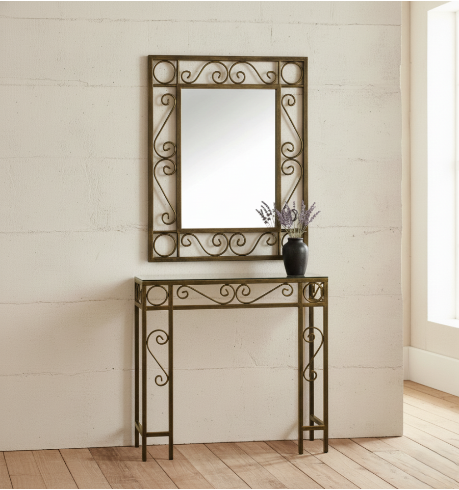 Consola de ferro forjado com espelho correspondente em estilo rústico e disponível em vários acabamentos de pintura.