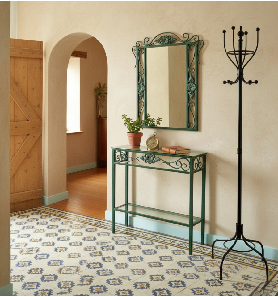 Forjando console estilo rústico Isabella feito em ferro forjado disponível em vários acabamentos.