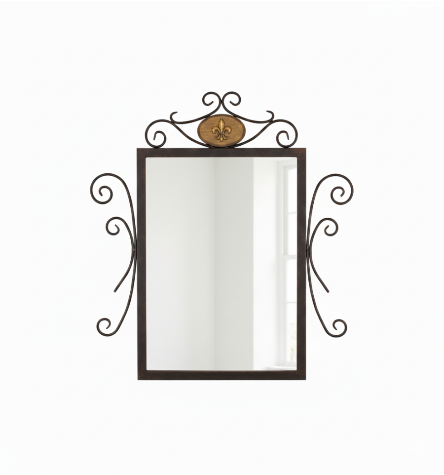 Apresentamos o estilo rústico forjando o espelho Alba. Este espelho é feito de ferro e tem um pequeno que representa a flor de lis no centro. Se você quer a entrada de sua casa para adquirir um ar rural, com este espelho você pode adquiri-lo.
