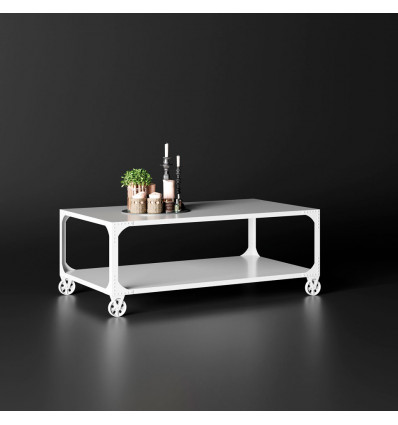 Macarena mesa de centro industrial com rodas, fabricada em chapa metálica com rebites nos cantos.
